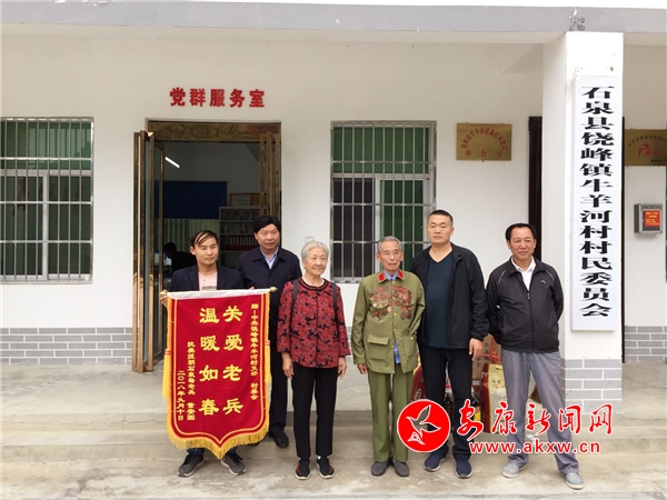 安康新聞網(wǎng)訊(通訊員 楊曉莉 王全軍 )“感謝牛羊河村委會(huì),感謝你們駐村工作隊(duì)啊!”身著退伍軍裝,勛章掛滿胸前的抗美援朝老兵董安國(guó)握著石泉縣饒峰鎮(zhèn)牛羊河村駐村工作隊(duì)隊(duì)長(zhǎng)王全軍的手連連道謝。大家還在納悶中,繡著“關(guān)愛(ài)老兵,溫暖如春”的錦旗由董安國(guó)夫人、牛羊河村村籍的王武英遞到了村支書張榮全手中。