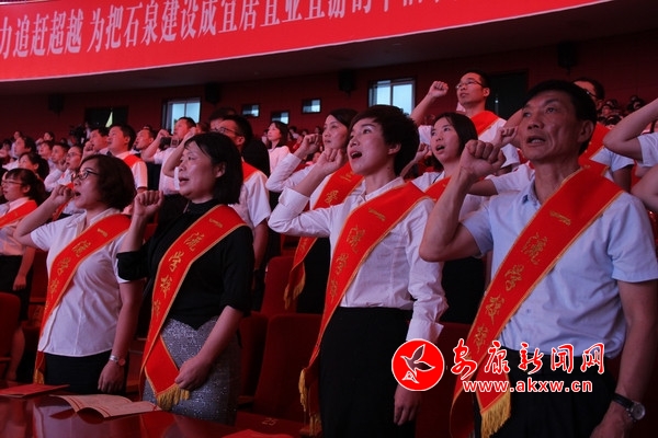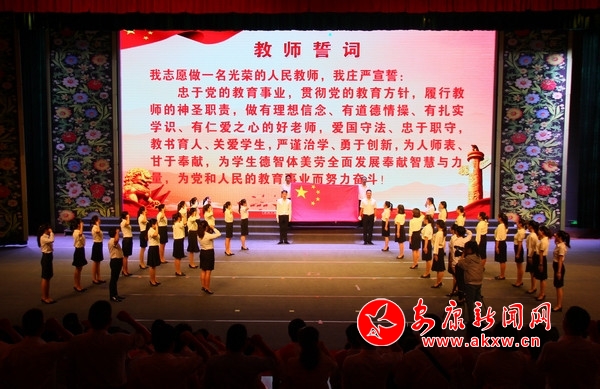 演出現(xiàn)場,對(duì)石泉中學(xué)等10 個(gè)“一流教育質(zhì)量單位”,李超旗等10名一流學(xué)校校長,陳興蘭等30名“一流教學(xué)能手”,楊細(xì)雨等50 名“三愛標(biāo)兵”進(jìn)行了表彰獎(jiǎng)勵(lì),2019年新入職的教師代表進(jìn)行了宣誓,老教師重溫了誓詞。