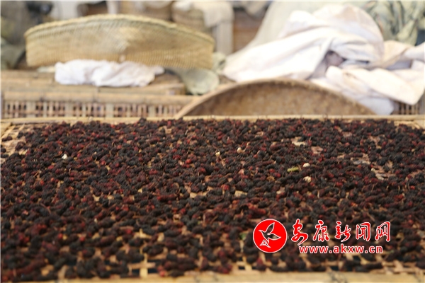 桑葚鮮果保鮮時(shí)間短,采摘后不及時(shí)銷售便會(huì)造成損失。明星村大陽(yáng)蠶桑支部通過(guò)和石泉縣錦絲盛農(nóng)業(yè)科技有限公司合作,采取“支部+合作社+公司+農(nóng)戶”的發(fā)展模式,將一部分鮮果通過(guò)工廠加工,將銷售價(jià)格為5元每斤的新鮮桑葚精選制成桑葚干,桑葚干售價(jià)60元每斤;另一部分桑葚釀造成桑葚果酒,還有一部分桑葚可以通過(guò)蒸餾古法烤酒的方式制成白酒。以此增加桑葚的附加值,通過(guò)提升桑葚的附加值,增加農(nóng)民的收入。