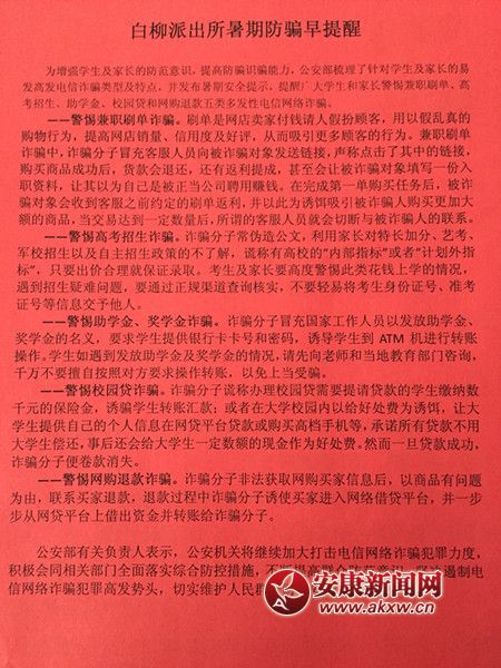 安康新聞網(wǎng)訊(通訊員 康倩)暑假,本是學(xué)生放松與家人相聚的溫馨時刻,但年年暑假都有很多不法分子,鉆了學(xué)生涉世未深,輕易相信他人的空子,對學(xué)生實施諸如發(fā)放助學(xué)金、暑期兼職等類型的電信詐騙。對此白柳派出所專門針對此類電信詐騙在轄區(qū)進行了廣泛宣傳,不僅學(xué)生需注意,家長更需警惕。