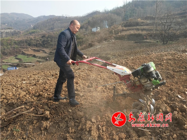在金寨鎮(zhèn)譚家院社區(qū)六組,45歲的煙農(nóng)朱章斌正在煙田熟練操縱著旋耕機,他趁著最近晴好天氣,啟動春耕整地工作。