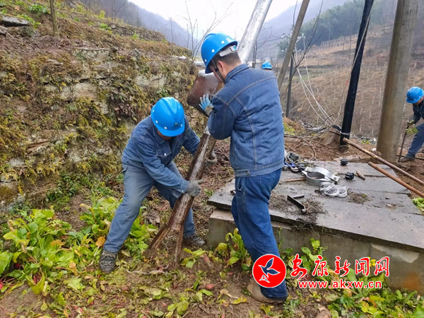 天寒地凍,恢復供電刻不容緩,搶修隊員火速趕赴故障現(xiàn)場,明確責任分工、落實安全措施,在大雪紛飛中迎難而上。小雨夾雜著雪花不停降下,給施工增大了難度,桿塔覆冰,腳扣極易打滑,面對如此惡劣的環(huán)境,搶修隊員只能用工具一點點敲掉薄冰后,再小心翼翼地登桿作業(yè)。