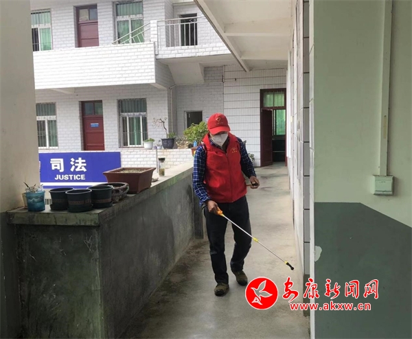志愿者在鎮(zhèn)政府走廊消毒消殺