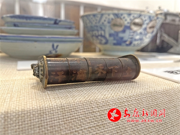 轉(zhuǎn)入內(nèi)間,是鎮(zhèn)史溯源板塊,大事紀要展板條理清晰,各類農(nóng)耕用具散布各處。其中一個玻璃展柜格外顯眼,展柜中一摞青花瓷碟碗痕跡斑駁,一把藏詩鎖靜靜躺在一旁。只見橫式的圓柱體銅鎖有5個撥輪,上面共有20個行書漢字,連讀起來正是唐詩《憫農(nóng)》,銅鎖表層有重度磨痕,但字跡依舊清晰,鎖的兩側(cè)均鑄成獅子頭狀。“想打開這把鎖先得有文化、會識字,還得知道語句特有的順序。”據(jù)這件銅鎖的捐贈者梁延介紹,這把密碼鎖是原屬于金寨一家大戶,是祖?zhèn)鞯奈锛䞍骸?span style="display:none">T5i安康新聞網(wǎng)