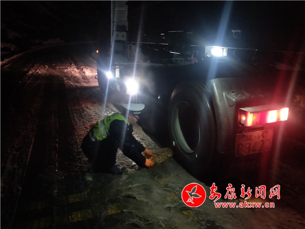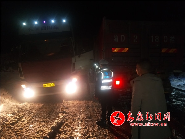 1月6日至8日鎮(zhèn)坪持續(xù)大到暴雪天氣,雞心嶺路段因海拔較高,積雪結(jié)冰嚴(yán)重,導(dǎo)致30余輛大型貨車滯留。鎮(zhèn)坪交警及時上山疏導(dǎo)交通,對發(fā)生緊急情況的車輛進(jìn)行救援,并對未采取防滑措施的車輛進(jìn)行勸返,截至1月8日上午11時交警仍然在該路段進(jìn)行救援工作。(圖文/趙榮鵬)JxD安康新聞網(wǎng)