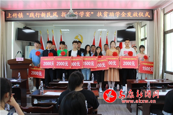在升學禮上,宣讀了《上竹鎮(zhèn)2020年度“踐行新民風•不辦升學宴”教育扶貧助學活動實施方案》,按照一本2000元,二本1500元的標準為18學生發(fā)放了扶貧助學金,共計30500元。學生代表印想想發(fā)言,她表示,堅決向“升學宴”“謝師宴”說不,自己會更加努力學習,不負眾望,知恩感恩,做文明新風的倡導者。學生家長代表陳昌瓊在儀式上發(fā)言,將一如既往地弘揚新民風,自覺抵制大操大辦、鋪張浪費,做移風易俗的踐行者。在活動現(xiàn)場,學生家長也倍感自豪,臉上洋溢著幸福的笑容,紛紛表示,黨委政府通過開展新穎的慶;顒,給孩子們留下珍貴的記憶,既達到了革除陋習的目的,讓“里子”好,又讓百姓“面子”亮。