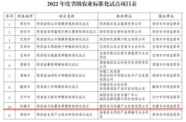本網(wǎng)訊(通訊員 李東昇 李秦鄂)10月24日,陜西省市場監(jiān)管局發(fā)布了2022年度省級農(nóng)業(yè)標(biāo)準(zhǔn)化試點項目,由鎮(zhèn)坪縣市場監(jiān)管局推薦,鎮(zhèn)坪縣馬鈴薯產(chǎn)業(yè)發(fā)展有限公司承擔(dān)的馬鈴薯良種繁育標(biāo)準(zhǔn)化試點項目榜上有名。據(jù)悉,此次全省獲批的項目僅有11個。該項目也是安康市2022年度唯一一個省級農(nóng)業(yè)標(biāo)準(zhǔn)化試點項目。