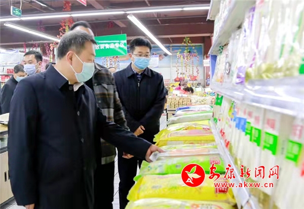 (市長武文罡在喜盈門超市南環(huán)路店實地查看米面等生活必需品供應情況)