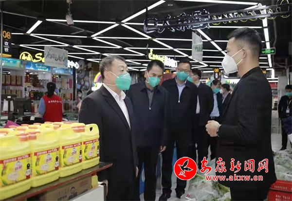 武文罡一行在紫陽(yáng)縣城關(guān)鎮(zhèn)會(huì)仙橋社區(qū)萬(wàn)友超市檢查生活物資供應(yīng)情況。記者 吳單 攝