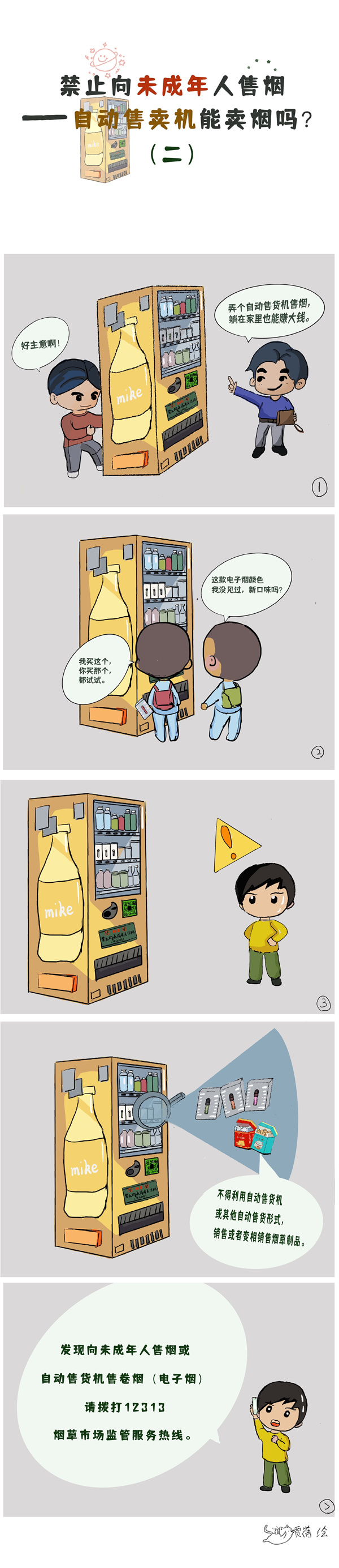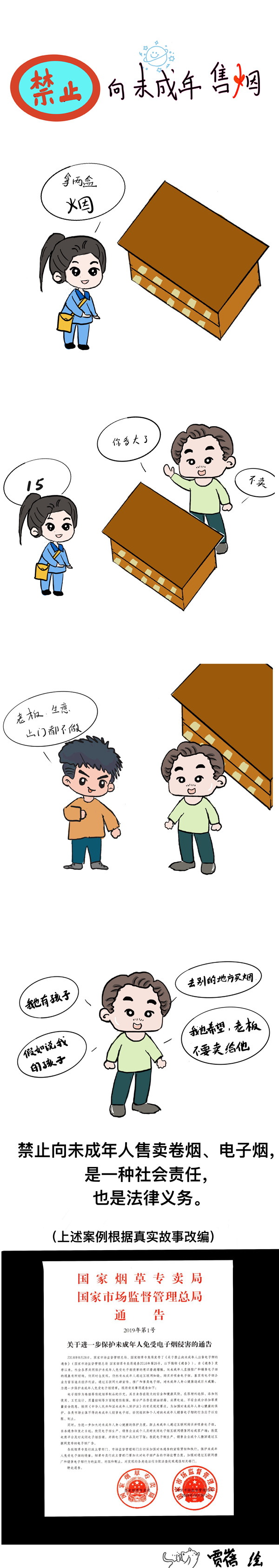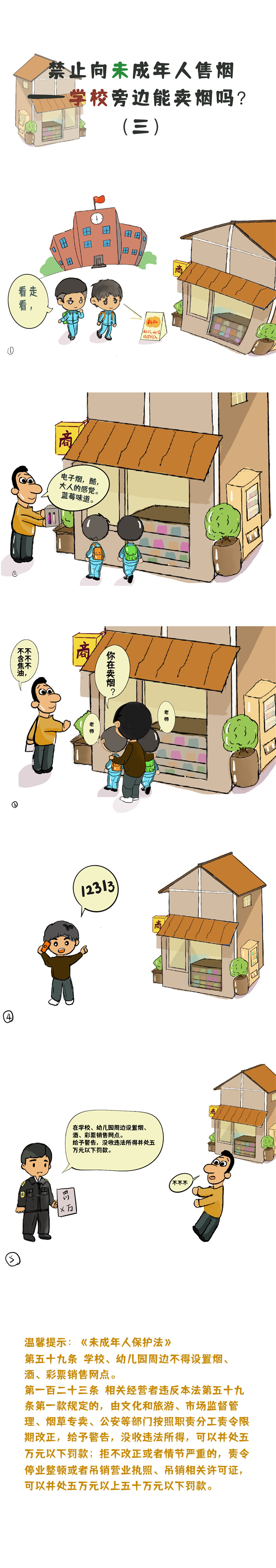《中華人民共和國(guó)未成年人保護(hù)法》中提到禁止向未成年人售煙,那么生活中遇到這些情況我們?cè)撛趺醋瞿兀空?qǐng)看下列漫畫(huà)。(賈蓓 繪制)