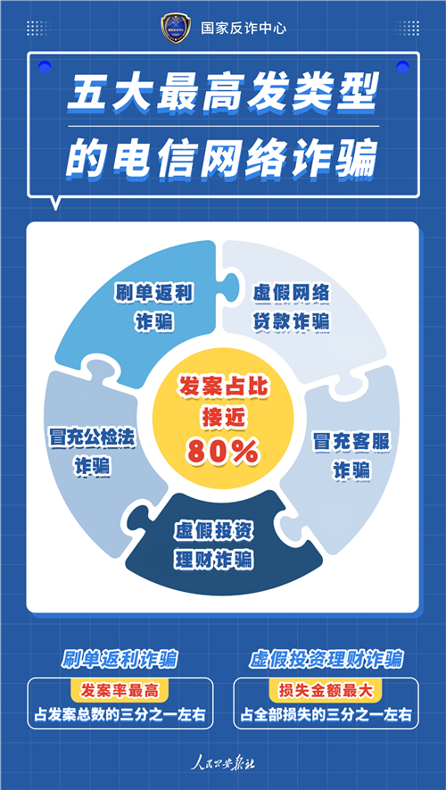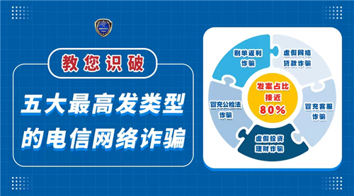 五大最高發(fā)類型的電信網(wǎng)絡(luò)詐騙海報(bào)