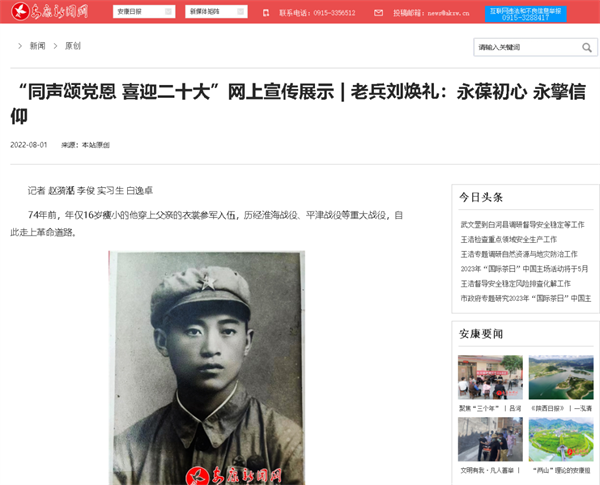 安康新聞網(wǎng)始終堅(jiān)持傳達(dá)正確立場、觀點(diǎn)、態(tài)度,持續(xù)做好正能量典型宣傳,做有態(tài)度、有溫度的新聞精品,發(fā)布如《“同聲頌黨恩 喜迎二十大”網(wǎng)上宣傳展示 | 老兵劉煥禮:永葆初心 永擎信仰》《旬陽老黨員收集千余件紅色藏品》《活出尊嚴(yán)的120個生命》等優(yōu)質(zhì)稿件。