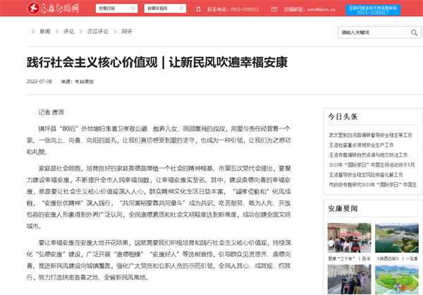 安康新聞網(wǎng)大力宣傳和踐行社會主義核心價值觀,大力宣傳中國夢,全媒體開設(shè)“社會主義核心價值觀”“新時代 新經(jīng)典”“我們的中國夢 文化進(jìn)萬家”等專欄,刊出《黨員干部要帶頭踐行核心價值觀》《讓新民風(fēng)吹遍幸福安康》《漢濱區(qū)市場監(jiān)管局:用心培育“文明花”》等一批重點(diǎn)稿件,正黨風(fēng)、淳民風(fēng)、興家風(fēng)、樹新風(fēng),宣傳人民群眾為實(shí)現(xiàn)中國夢而奮勇拼搏的事跡,讓社會主義核心價值觀深入人心。