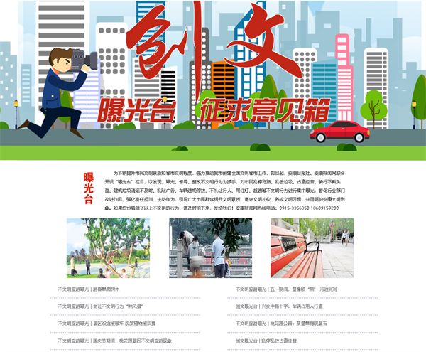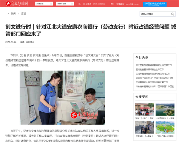 安康新聞網(wǎng)履行媒體輿論監(jiān)督職能,聚焦民生熱點(diǎn),開辦《創(chuàng)文曝光臺》輿論監(jiān)督專欄,對不文明現(xiàn)象進(jìn)行曝光揭露,發(fā)布批評性報(bào)道60余篇,微信視頻號采寫制作曝光類視頻稿件10余件,為提升市民文明素質(zhì)和城市文明程度,貢獻(xiàn)媒體力量。同時積極開展調(diào)查性報(bào)道,追蹤事件真相,發(fā)布《創(chuàng)文進(jìn)行時|針對江北大道安康農(nóng)商銀行(勞動支行)附近占道經(jīng)營問題 城管部門回應(yīng)來了》等一批原創(chuàng)新聞,反映群眾呼聲,推進(jìn)問題解決,體現(xiàn)地方黨媒的責(zé)任與擔(dān)當(dāng)。