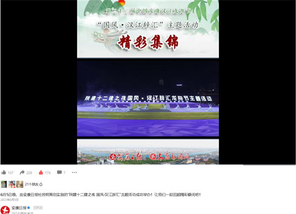 深化融合創(chuàng)新,全力打造高附加值文化創(chuàng)意產(chǎn)品。2022年第二十二屆中國安康漢江龍舟節(jié)期間,由安康日報(bào)社統(tǒng)籌承辦“國風(fēng)·漢江辭匯”主題公益演出活動,安康新聞網(wǎng)全力配合,落實(shí)晚會執(zhí)行、線上直播、采風(fēng)活動全程宣傳,“國風(fēng)·漢江辭匯”演出全網(wǎng)現(xiàn)場直播,點(diǎn)擊量達(dá)到100W+;顒舆引發(fā)全網(wǎng)多家媒體爭相報(bào)道。截至目前,包括人民日報(bào)、中央廣播電視總臺《藝術(shù)傳承》官網(wǎng)、今日頭條、北京在線、山東熱線等70余家中省市媒體單位陸續(xù)轉(zhuǎn)載報(bào)道。