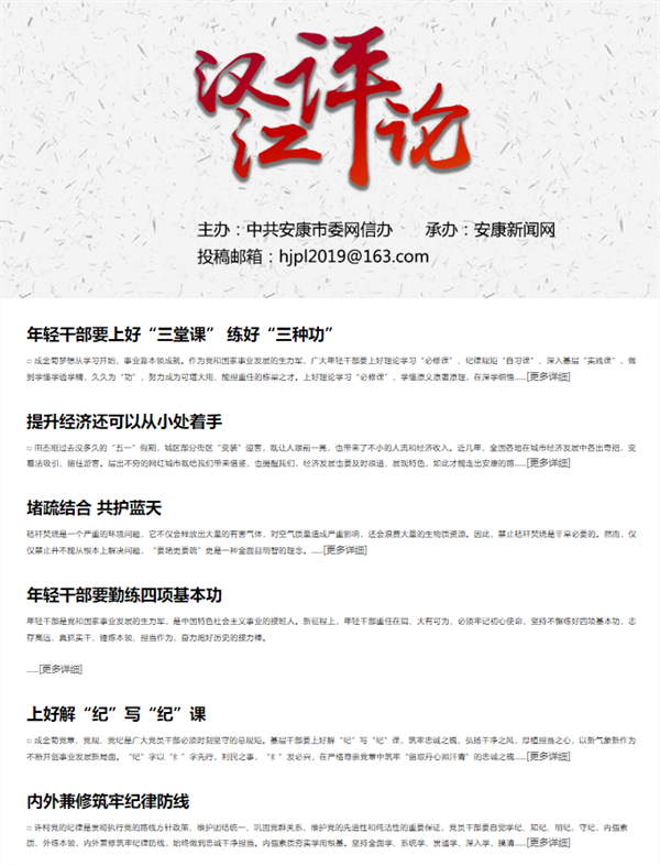 三是圍繞省委、市委“三個年”活動部署,網(wǎng)站開設(shè)“一把手開麥——聚焦‘三個年’”專欄,聚焦我市“高質(zhì)量項目推進(jìn)年、營商環(huán)境突破年、干部作風(fēng)能力提升年”主題報道,為推進(jìn)安康高質(zhì)量項目發(fā)展、助力擦亮“營商環(huán)境最安康”金字招牌、提升全市干部作風(fēng)能力,營造濃厚良好輿論氛圍。