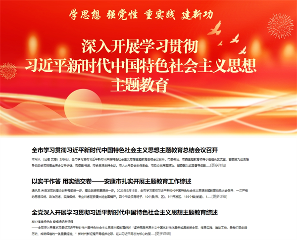 二是圍繞“深入開展學(xué)習(xí)貫徹習(xí)近平新時代中國特色社會主義思想主題教育”。安康新聞網(wǎng)認(rèn)真統(tǒng)籌謀劃,深入開展學(xué)習(xí)貫徹習(xí)近平新時代中國特色社會主義思想主題教育宣傳報道工作。網(wǎng)站及時推出“深入開展學(xué)習(xí)貫徹習(xí)近平新時代中國特色社會主義思想主題教育”專欄,介紹我市、各縣(市、區(qū))及單位部門組織開展主題教育的經(jīng)驗做法。