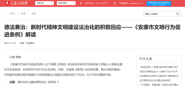 2023年,安康新聞網(wǎng)站準(zhǔn)確刊播政策消息,保證了政務(wù)消息、惠民消息及時準(zhǔn)確地傳播。發(fā)揮黨媒資源優(yōu)勢,準(zhǔn)確闡釋解讀市委、市政府的重要決策和惠民政策,刊出《德法兼治:新時代精神文明建設(shè)法治化的積極回應(yīng)——〈安康市文明行為促進(jìn)條例〉解讀》《安康市2023年義務(wù)教育階段學(xué)校招生入學(xué)政策解讀》,從群眾關(guān)切入手,提升媒體服務(wù)質(zhì)量和為民服務(wù)意識。