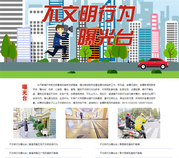 安康新聞網(wǎng)履行媒體輿論監(jiān)督職能,聚焦民生熱點,開辦《不文明行為曝光臺》輿論監(jiān)督專欄,集中曝光身邊的不文明現(xiàn)象、行為,引導(dǎo)市民群眾自覺規(guī)范文明行為,主動融入城市文明創(chuàng)建熱潮,為提升市民文明素質(zhì)和城市文明程度貢獻(xiàn)媒體力量。同時,聚焦群眾關(guān)切,積極開展調(diào)查性報道,發(fā)布《〈安康市物業(yè)服務(wù)與管理條例〉關(guān)“我們”什么事?》等一批原創(chuàng)新聞,還原事件真相,及時宣講與群眾生活息息相關(guān)的最新政策條例,體現(xiàn)地方黨媒的責(zé)任與擔(dān)當(dāng)。