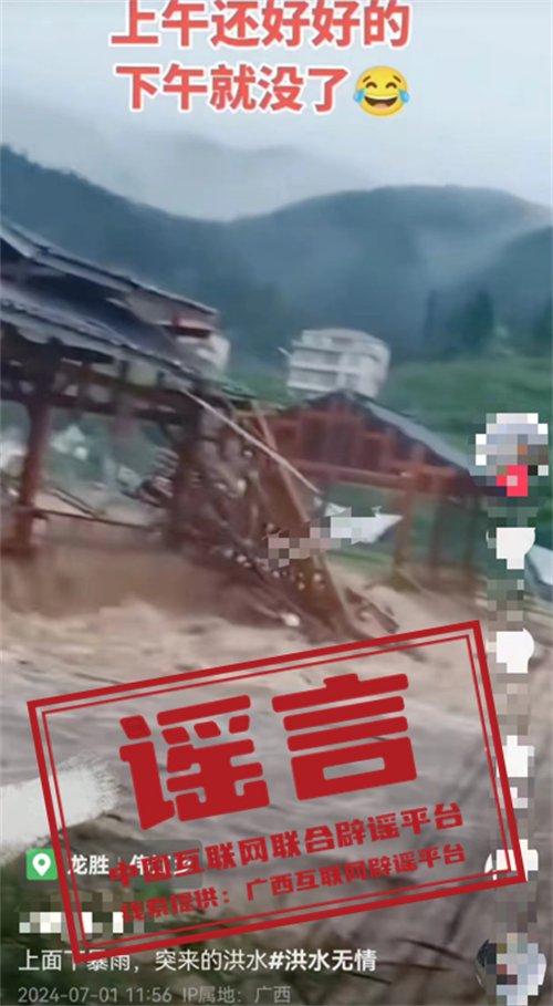 詳情:近日,有網(wǎng)民發(fā)布視頻稱“桂林龍勝一風(fēng)雨橋被洪水沖毀”,并配文“上午還好好的,下午就沒了”,引發(fā)關(guān)注。經(jīng)當(dāng)?shù)毓膊块T核實(shí),偉江鄉(xiāng)轄區(qū)內(nèi)風(fēng)雨橋完好無(wú)損,不存在倒塌的情況。該視頻系當(dāng)?shù)鼐W(wǎng)民龍某某罔顧事實(shí)、故意編造,將網(wǎng)上看到的其他地方的風(fēng)雨橋被毀視頻重新編輯并定位在偉江鄉(xiāng)進(jìn)行發(fā)布。目前,警方已依法對(duì)龍某某予以行政處罰。(來(lái)源:廣西互聯(lián)網(wǎng)辟謠平臺(tái)、龍勝公安)