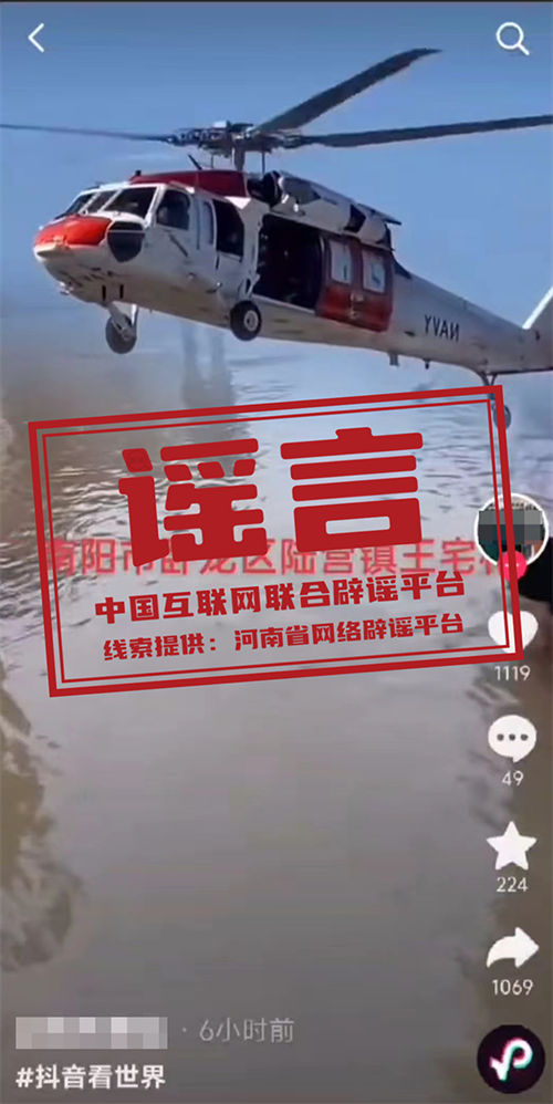 7月15日,網(wǎng)民“賓利xx”在某短視頻平臺(tái)發(fā)布視頻稱“南陽(yáng)市臥龍區(qū)陸營(yíng)鎮(zhèn)王莊村被水淹,臥龍區(qū)使用直升機(jī)進(jìn)行救援”。經(jīng)核實(shí),臥龍區(qū)未使用直升機(jī)進(jìn)行救援,視頻是發(fā)布者使用軟件拼接而成,系虛假信息。