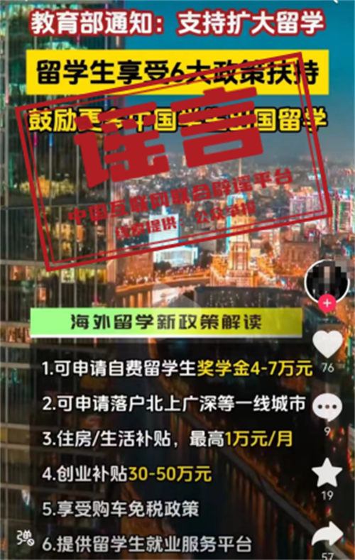 詳情:近日,有自媒體在多個(gè)網(wǎng)絡(luò)平臺(tái)發(fā)布視頻,稱“教育部留學(xué)中心召開(kāi)發(fā)布會(huì)宣布‘將擴(kuò)大支持留學(xué),留學(xué)生將享受申請(qǐng)自費(fèi)留學(xué)獎(jiǎng)學(xué)金、申請(qǐng)落戶一線城市等六大政策扶持’等留學(xué)新政策”。對(duì)此,教育部留學(xué)服務(wù)中心7月29日鄭重聲明:該視頻虛假不實(shí),我中心從未召開(kāi)此發(fā)布會(huì),從未發(fā)布過(guò)相關(guān)政策。所謂六大政策支持,主要是對(duì)部分地方有關(guān)政策的拼湊和夸大。請(qǐng)廣大留學(xué)生及公眾提高警惕,謹(jǐn)防上當(dāng)受騙。對(duì)此類造謠炒作行為,我中心保留追究相關(guān)方法律責(zé)任的權(quán)利。(來(lái)源:“教育部留學(xué)服務(wù)中心”微信公眾號(hào))
