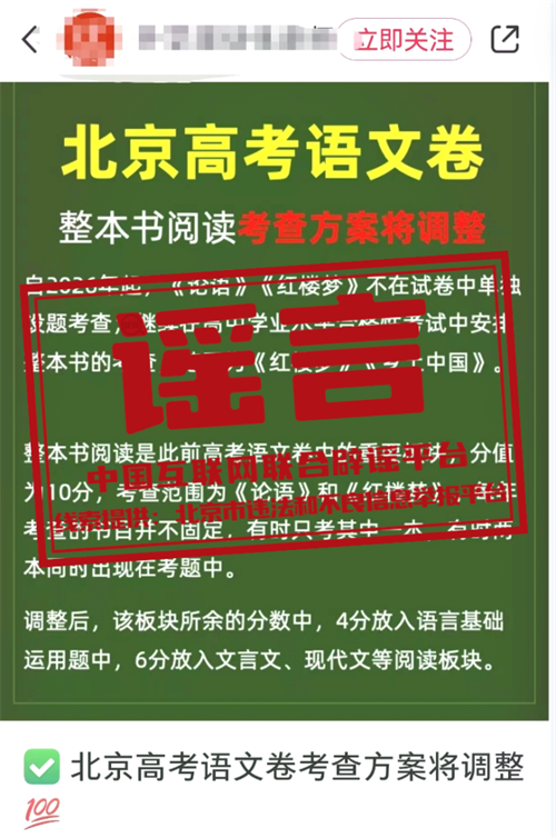 真相:近日,關(guān)于“北京高考語(yǔ)文學(xué)科整本書閱讀考查方式調(diào)整”的消息在網(wǎng)絡(luò)上傳播,引發(fā)社會(huì)發(fā)注。對(duì)此,北京教育考試院發(fā)表聲明稱:該網(wǎng)傳內(nèi)容為不實(shí)信息。北京教育考試院沒(méi)有發(fā)布對(duì)北京高考語(yǔ)文整本書閱讀考查方式調(diào)整的相關(guān)內(nèi)容,北京高考語(yǔ)文2025、2026年的學(xué)科考試內(nèi)容保持穩(wěn)定,范圍不變。(來(lái)源:北京市違法和不良信息舉報(bào)平臺(tái)、“首都教育”微信公眾號(hào))