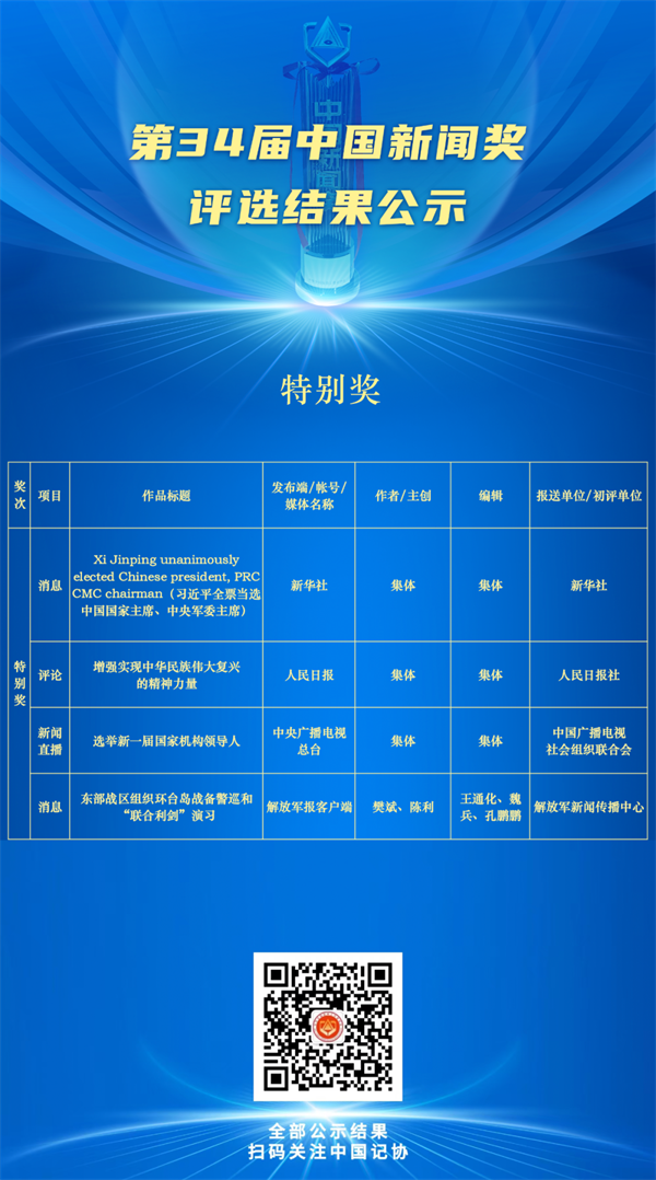 關(guān)于公示第34屆中國新聞獎評選結(jié)果的公告