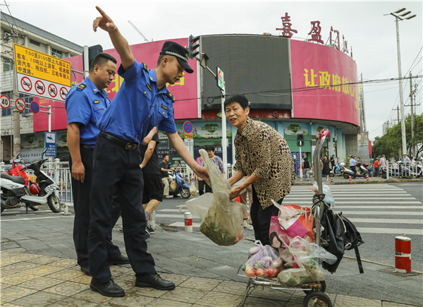 7月23日,江北交警、城管在中渡街整頓交通和農貿市場。(郭曉康)