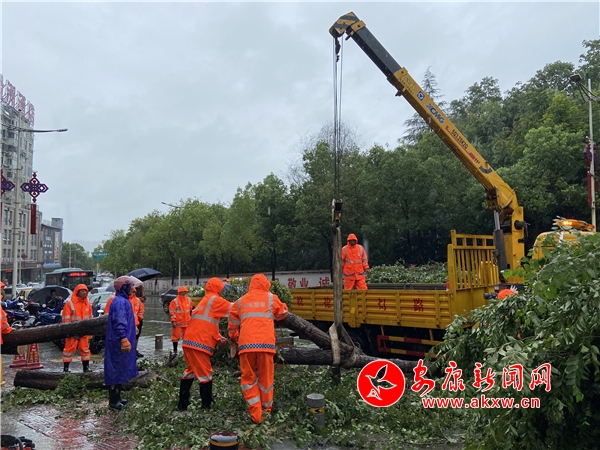 7月22日上午,位于黃溝路金城美墅小區(qū)門(mén)口,一棵碗口粗的大樹(shù)連根撥起,擋住了過(guò)往的車輛和行人,市政部門(mén)工作人員冒著大雨,正在清理。 (王國(guó)秀)RfC安康新聞網(wǎng)