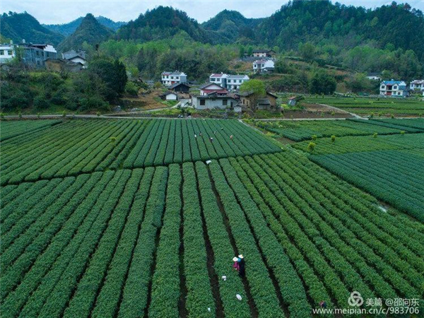 如今的紫陽,江還是那條江,梁還是那道梁,茶卻是越來越精致香純了,每到三月嫩芽初發(fā),江霧從水面慢慢升騰,毛茸茸的芽尖頂著露珠在晨光中閃耀,竹林掩映著白墻黛瓦,一縷炊煙合著柴雞的打鳴懶散飄過,采茶的姑娘腰系小竹簍,三五結伴在茶山穿行,人未見聲先來,嫩綠的樹林間搖擺著水蛇腰,老人說那是好山好水、好茶好飯養(yǎng)出的西妹兒。