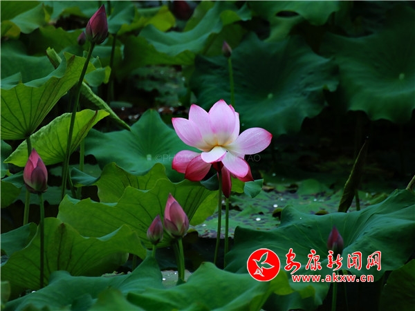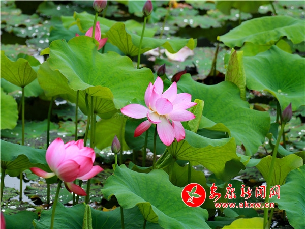 荷花開放嬌艷欲滴,有的亭亭玉立含苞待放,有的迎風(fēng)開放花團(tuán)錦簇,還有的羞羞答答半掩花蕊,在蓮花叢中時(shí)而會(huì)有花瓣飄落葉上,露出金黃色的蓮蓬和花蕊。uLh安康新聞網(wǎng)