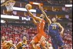 當(dāng)?shù)貢r間11月5日,火箭隊(duì)球員哈登(上左)在比賽中突破上籃。當(dāng)……
