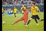 5月8日,天津權(quán)健隊球員莫德斯特(左一)在比賽中射門。