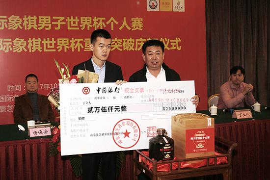 當(dāng)天的活動(dòng)中,山東景芝酒業(yè)股份有限公司董事長(zhǎng)劉全平為丁立人和卜祥志頒獎(jiǎng)。他透露,以后會(huì)重點(diǎn)加強(qiáng)與棋類項(xiàng)目的合作,為國(guó)際象棋事業(yè)的發(fā)展貢獻(xiàn)自己的力量,“預(yù)祝中國(guó)國(guó)象隊(duì)取得更加輝煌的成就”。