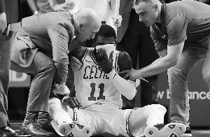 主場迎戰(zhàn)黃蜂,凱爾特人并不輕松,除去揭幕戰(zhàn)中重傷恐賽季報銷的海沃德,霍福德也因傷休戰(zhàn),波士頓三巨頭僅剩歐文一人,而他也在開場不久被隊友貝恩斯誤傷,面部遭肘擊后血灑賽場,無奈提前退賽。凱爾特人受此打擊后連丟5分,黃蜂打出9比0開局,并以26比11領先結束首節(jié)。上半場,兩隊分差被拉大到16分。