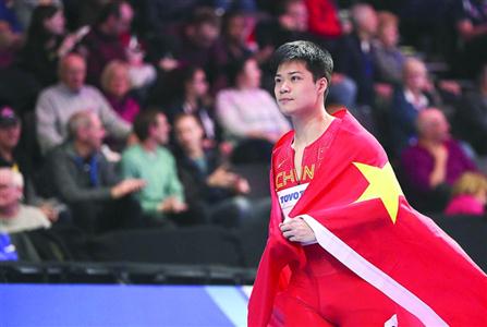 當成績顯示在大屏幕上,蘇炳添揮拳慶祝這來之不易的獎牌,他從看臺上接過一面五星紅旗,身披紅旗繞場一周慶祝勝利。