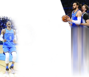擁有三巨頭的雷霆,依靠威少的個(gè)人發(fā)揮拿下比賽。大加索爾(右)此役復(fù)出與亞當(dāng)斯對位。