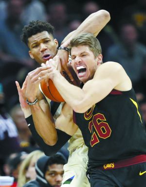 雄鹿隊球員安特托昆博(左)在比賽中和騎士隊球員科沃爾拼搶。 新華社/美聯(lián)