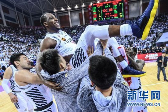 ↑遼寧隊球員在賽后將隊友哈德森(上)拋起,慶祝奪冠新華社記者潘昱龍攝