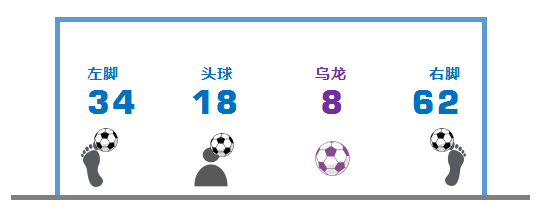本屆世界杯小組賽中球員用右腳打入62粒進(jìn)球、左腳34粒、有18粒進(jìn)球是用頭球打入(未統(tǒng)計(jì)8粒烏龍球的踢球部位),而進(jìn)球方式中,除普通進(jìn)球方式外,點(diǎn)球和頭球各打入了18粒進(jìn)球。r9T安康新聞網(wǎng)