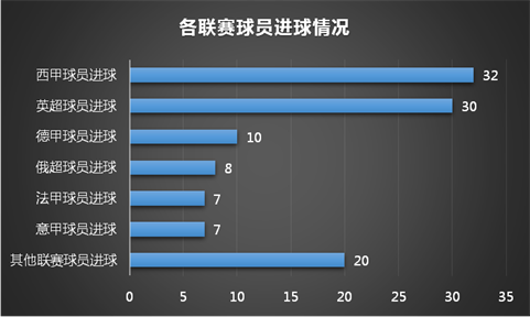 從小組賽進(jìn)球的球員所屬聯(lián)賽分布來(lái)看,來(lái)自14個(gè)國(guó)家的21名西甲球員包辦了最多的32粒入球,英超球員打入了30粒進(jìn)球排名第二,來(lái)自五大聯(lián)賽的德甲、法甲、意甲球員分別打入了10粒、7粒和7粒,值得一提的是,來(lái)自3個(gè)國(guó)家的5名俄超聯(lián)賽球員共打入了8粒進(jìn)球,排名第4,而來(lái)自廣州恒大淘寶的韓國(guó)球員金英權(quán)是中超球員打入世界杯入球的唯一球員。r9T安康新聞網(wǎng)