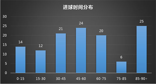 本屆世界杯讓大家印象深刻的是出現(xiàn)了多場(chǎng)比賽的絕殺與絕平的比賽,而從進(jìn)球時(shí)間分布來(lái)看,也印證了這一點(diǎn),據(jù)統(tǒng)計(jì),在比賽的85+分鐘進(jìn)球的數(shù)量達(dá)到了25粒,占總進(jìn)球的20.5%,其次是下半場(chǎng)開(kāi)場(chǎng)后的15分鐘,進(jìn)球數(shù)達(dá)到了24粒。r9T安康新聞網(wǎng)