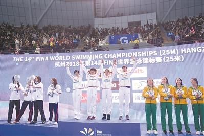 今晚,杭州2018年第14屆FINA世界游泳錦標(biāo)賽(25米)決出了7個(gè)項(xiàng)目的金牌,其中,李冰潔、楊,u、張雨涵、王簡(jiǎn)嘉禾組成的中國女隊(duì)以7分34秒08的成績(jī)打破亞洲紀(jì)錄,力壓美國隊(duì)和澳大利亞隊(duì)奪得了女子4×200米自由泳接力的金牌,這是中國游泳隊(duì)在本屆短池世錦賽上的第3枚金牌,也是王簡(jiǎn)嘉禾個(gè)人第2枚金牌。