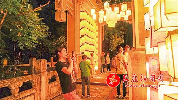 在安瀾樓南側(cè),刻有金州八景的燈籠高高懸掛,穿上漢服,提著燈籠,走向?yàn)懮蠠魰?huì),感受花燈如晝。移步廊道,徜徉安瀾夜市,感受煥然一新的公園氛圍、琳瑯滿目的文創(chuàng)精品和目不暇接的特色非遺。