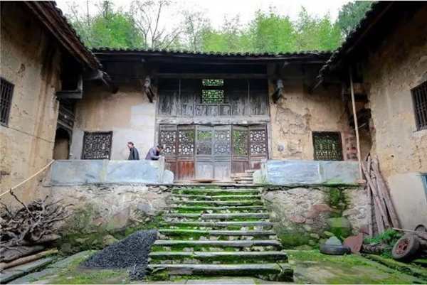 經(jīng)天井院上九步石梯到長(zhǎng)廊,此廊為石栓石欄。正面堂屋為六開槅扇門,門窗為土木雕刻工藝,國(guó)文壽字,古銅錢、蝙蝠、冬瓜圈、梭子圈、卷草等工藝。此處為黃家紙廠議事之地,巧借地勢(shì)突出氣勢(shì),雖只兩層,卻與兩邊三層廂房等高,借助前面的大天井采光,構(gòu)成院中府第,顯然是吸取了湖廂府衙式建筑理念。從堂屋前的過道可通往東西兩側(cè)小天井,面向大門,西側(cè)小天井因地勢(shì)縮進(jìn)2米,但建有曬樓(陽(yáng)臺(tái)),雖然天井狹小,但天井里鑿內(nèi)池、留溝防、設(shè)路徑、安石碑,甚至連置盆栽種都應(yīng)有盡有,雖然時(shí)光侵蝕,破損嚴(yán)重,但遺跡清晰可辨,足見主人生活饒有情趣。