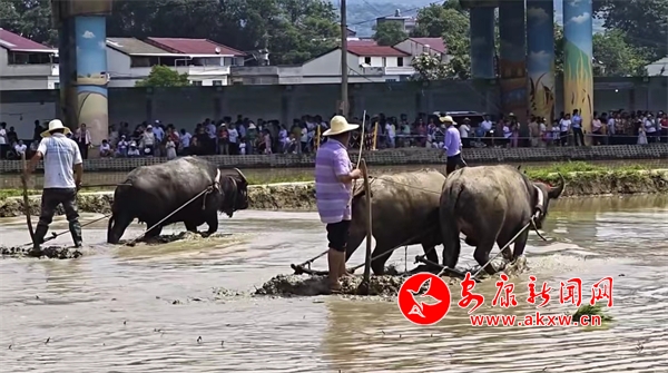 沿著316國道,我徑直把車開進了袁莊村。四周蒼翠的青山之間,綠蔥蔥秧苗已經(jīng)緩過神了,微風(fēng)吹過,似乎有稻香拂面。秧苗的葉子隨風(fēng)微顫,似乎在竊竊私語;南山青黛、村落靜美,炊煙裊裊,彌散出固有的芬芳;還有那犄角上系著紅綢、脖子懸掛鈴鐺的水牛,也準(zhǔn)備著插秧節(jié)暨文旅商貿(mào)活動的開幕式展演。身著粗布衣服的農(nóng)夫,腳踩涓涓流淌的溪水,擼一把青草塞進水牛嘴里,它們悠閑地?fù)u晃著腦袋,慢嚼細(xì)咽起來。