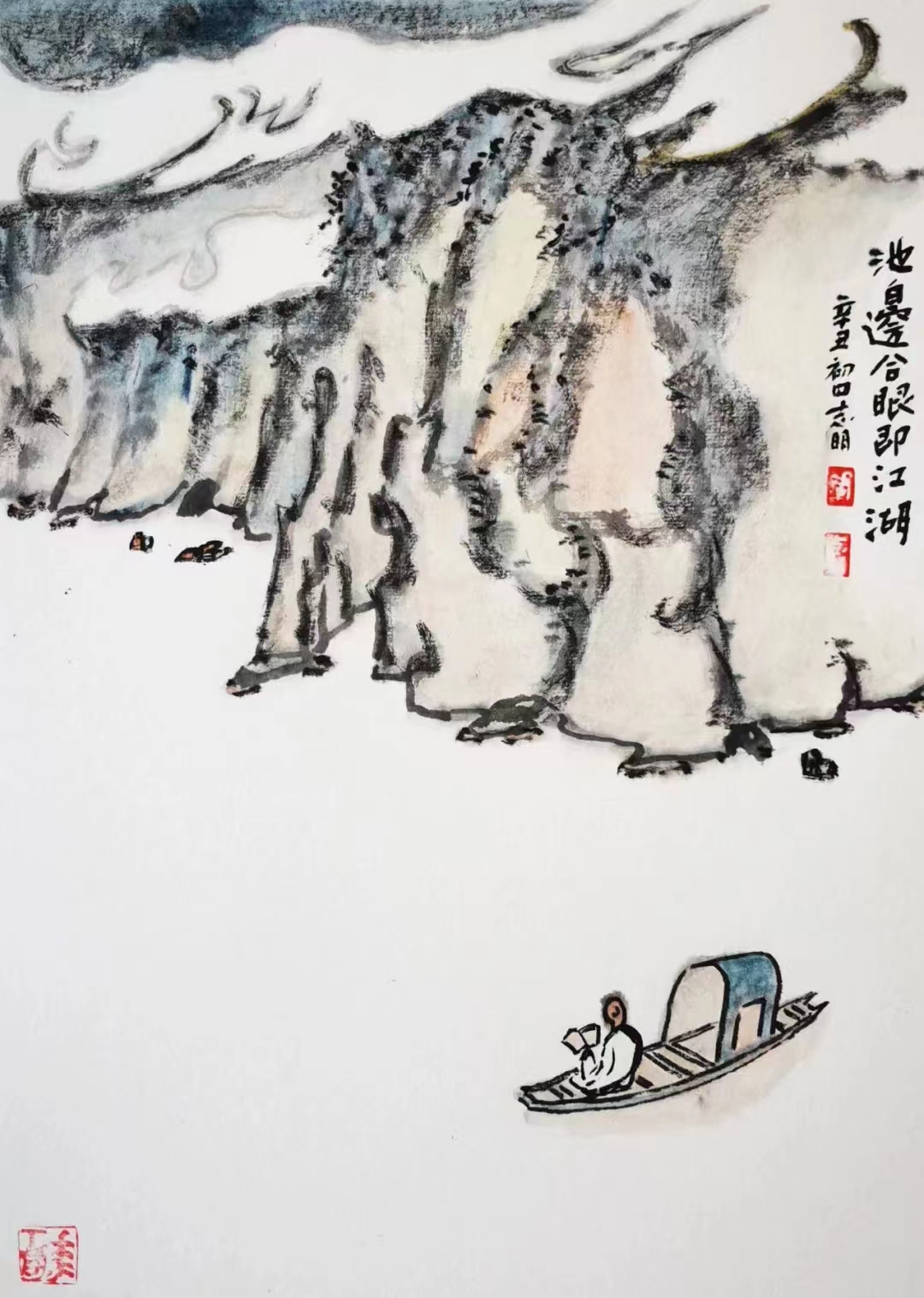 記得那一年的端午節(jié),鞏志明發(fā)來(lái)短信,是他寫(xiě)的一首詩(shī):綠粽黃酒聚江邊,白帆紅燭祭屈原。三千清淚流不得,九萬(wàn)渾念飄上天。誰(shuí)有郁悶誰(shuí)散淡,何謂圓滑何忠奸。十丈風(fēng)塵古今在,談笑真?zhèn)位聼煛?017年,我遷新居,鞏老師為我寄來(lái)小品畫(huà)《福到眼前》,我很喜歡,并懸掛至新居玄關(guān)。這些年,鞏志明老師常做影展畫(huà)展策劃及影評(píng)講座,自已也臨池不輟,水墨丹青,寄情抒懷,他的文人小品有思想性、有創(chuàng)造性。雖畫(huà)的是松風(fēng)明月,小舟流水或遠(yuǎn)古人物,但都寄托了他當(dāng)下的心境,以消塊壘。誠(chéng)如有人評(píng)論他為“吾師真文人,畫(huà)亦真性情!”他不僅只是身居畫(huà)室的怡情文人,他亦是心憂(yōu)天下的豪俠。面對(duì)世間不平事,他也是激揚(yáng)文字,揮斥方遒!在功利的當(dāng)下,鞏志明尤其顯得難能可貴!